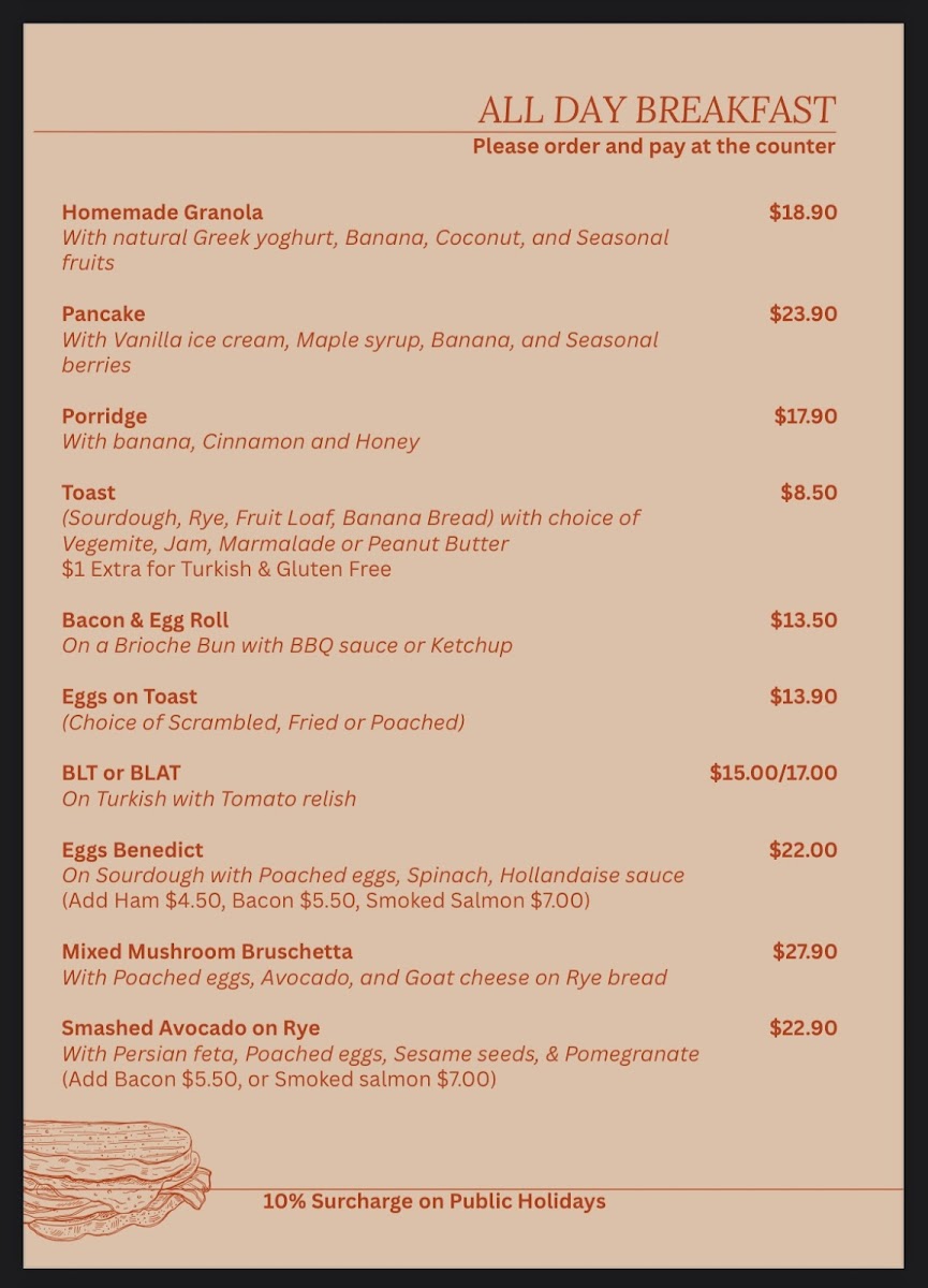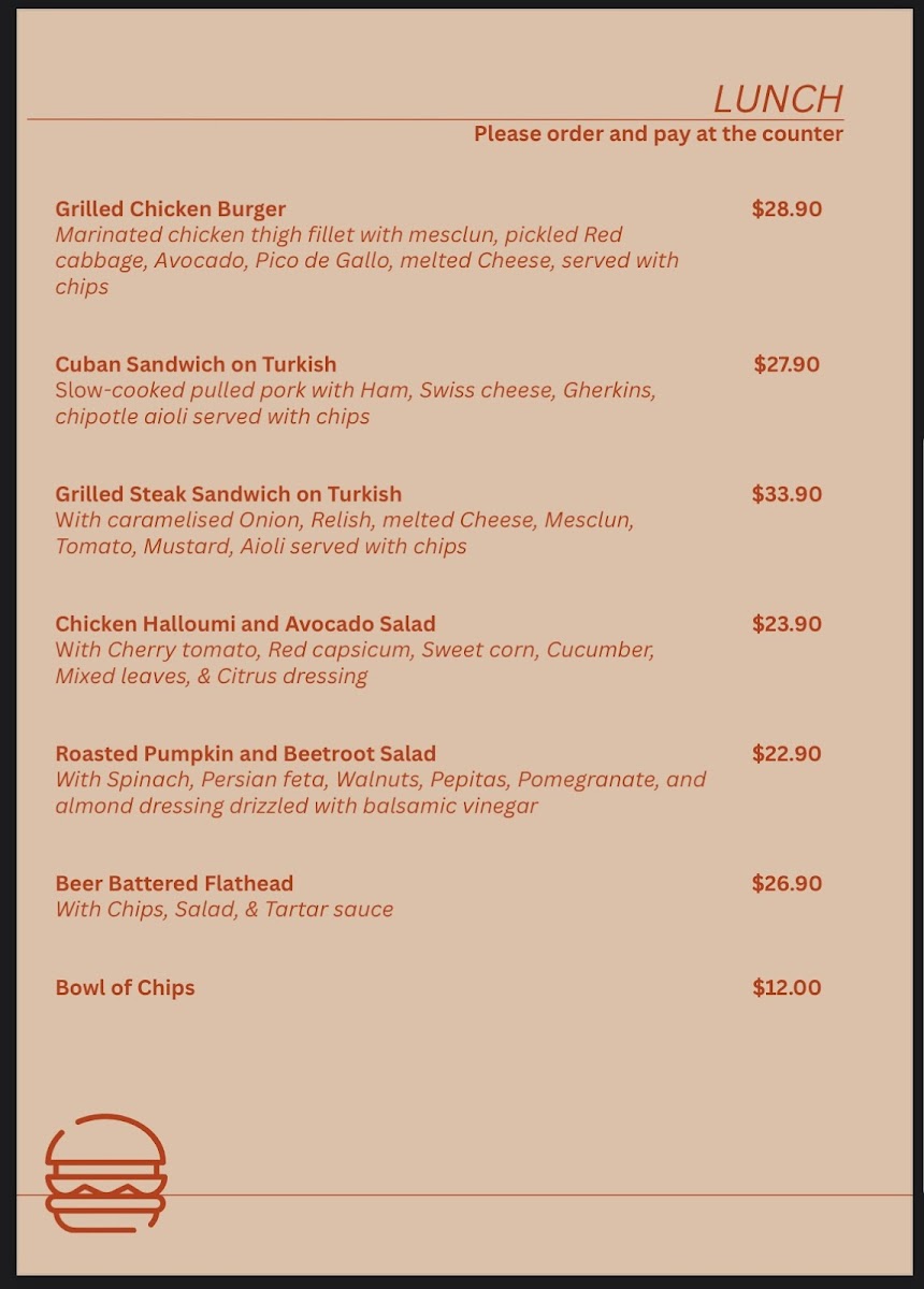 Savor the Grilled Chicken Burger or indulge in the Cuban Sandwich crafted on Turkish bread. The grilled steak sandwich and succulent beer-battered flathead are also crowd favorites, while the Roasted Pumpkin and Beetroot Salad brings a fresh, nutritious option. - All-Day Breakfast: